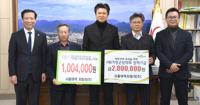 또한 박종덕 서흥여객 자동차(주) 대표는 아림1004운동에 100만 4,000원과 거창군장학회 200만 원을 기부하면서 “좋은 일에 동참할 수 있어서 기쁘고, 앞으로도 관내 지역사회의 어려운 이웃에게 관심을 가지고 지속적으로 기부하겠다”고 소감을 밝혔다.