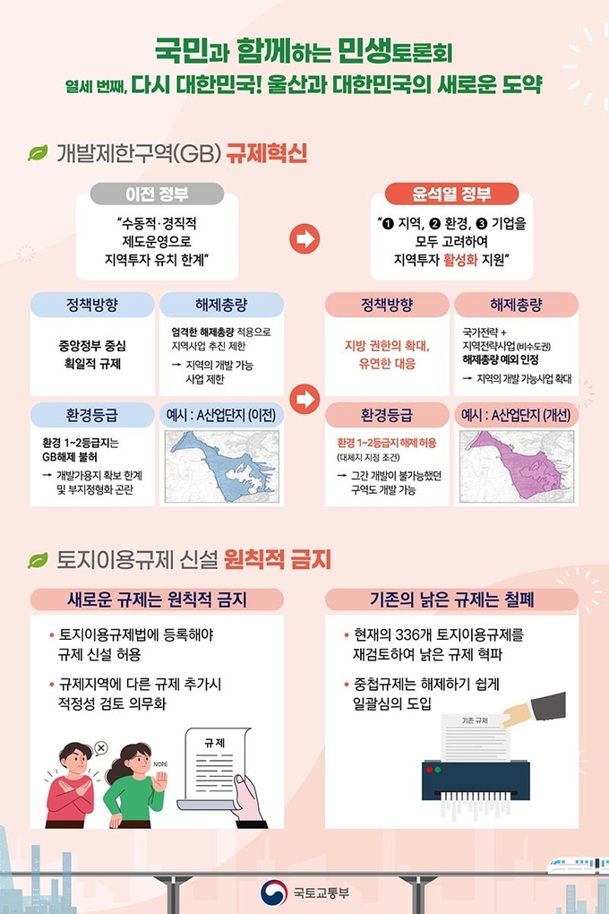 이날 토론회에서는 국민의 토지 이용 자유를 확대하고 울산을 산업허브로 육성하기 위해 대표적인 토지규제인 개발제한구역(GB) 및 농지규제에 대한 정부의 개선 방향을 보고하고 이에 대한 다양한 논의가 이뤄졌다.
