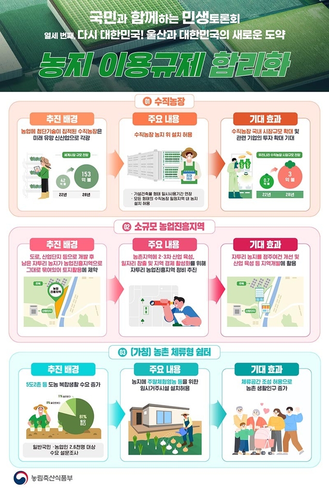 이와 함께 스마트팜 시설 등으로 농업 생산성을 향상시킬 수 있는 수직농장의 농지 내 설치가 허용된다. 도시민, 주말체험영농인이 농촌 지역에 체류할 수 있는 임시거주시설인 ‘농촌 체류형 쉼터’도 도입된다.