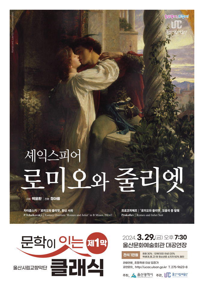 [경남도민뉴스] 울산시립교향악단은 3월 29일 오후 7시 30분 울산문화예술회관 대공연장에서 문학이 잇는 클래식 제1막으로 셰익스피어의 희곡을 클래식 선율로 담은 ‘로미오와 줄리엣’을 무대에 올린다고 밝혔다.
