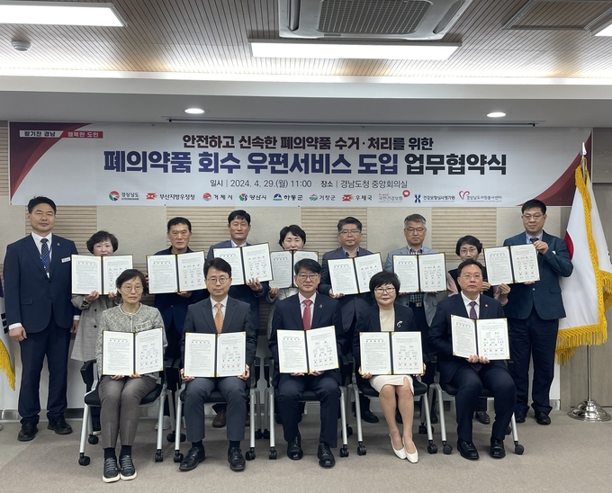 [경남도민뉴스] 경남도(도지사 박완수)와 부산지방우정청(청장 강도성)은 폐의약품 회수 우편서비스 도입과 올바른 폐의약품 배출 체계 마련을 위해 29일 도청 중앙회의실에 13개 기관이 모여 폐의약품의 안전하고 신속한 수거·처리를 위한 업무협약을 체결했다고 밝혔다.