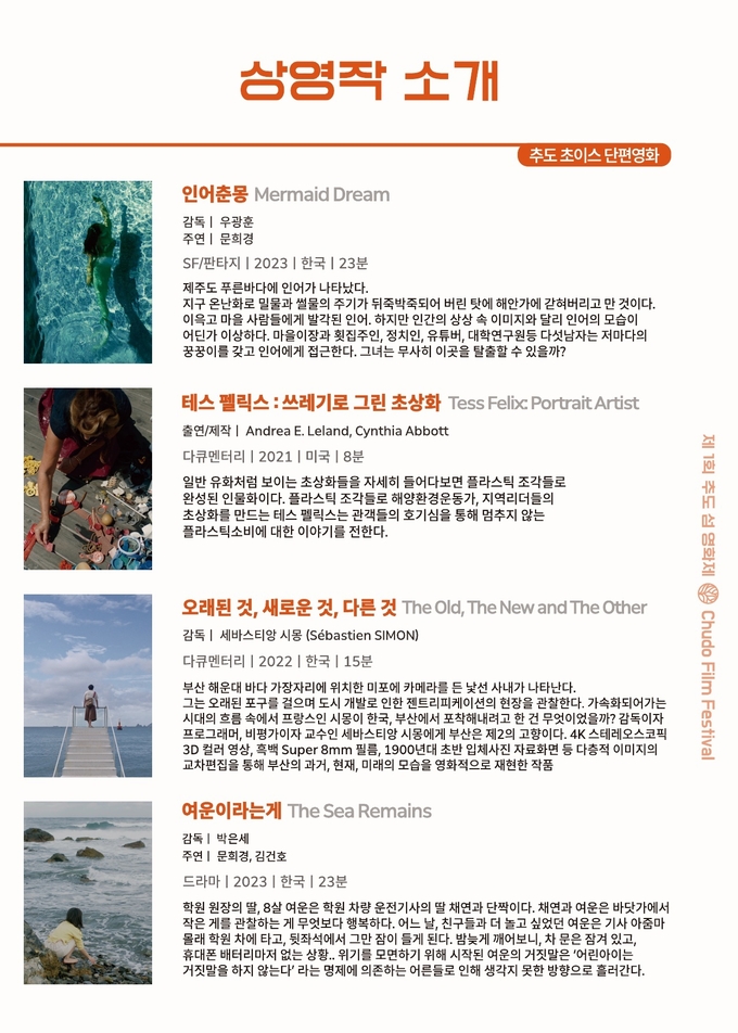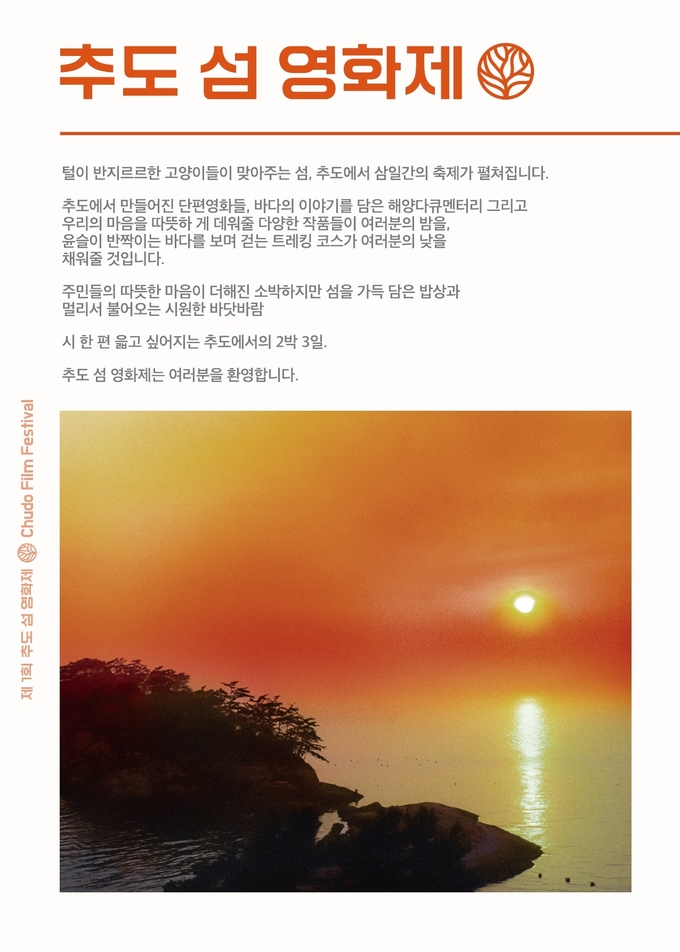 ‘제1회 섬 영화제’는 복효근 시인의 ‘섬의 동사형’이라는 주제로 ▲지역 체류 단편영화 제작 ▲감독과 영화인이 만나는 관객과의 대화 ▲푸드 스타일리스트와 섬 주민들이 함께 차려내는 ‘선셋 다이닝’ ▲추도의 아름다운 길 등산로 탐방 ‘이바구 트레킹’ ▲지속가능한 섬 영화제 발전방향을 위한 ‘영화제 포럼’ 등을 준비하였다.