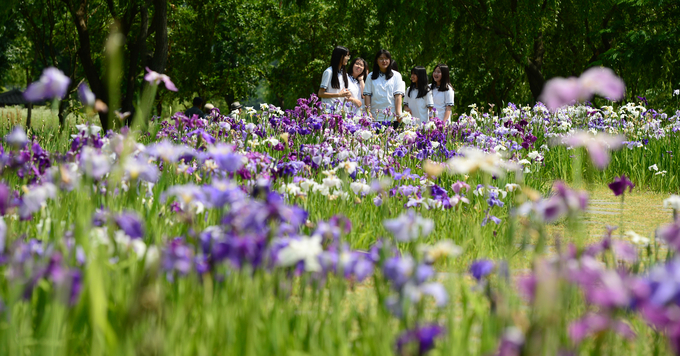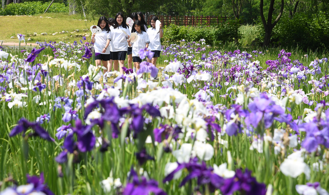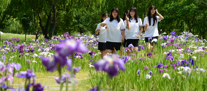 [경남도민뉴스] 단오날(음력5월5일)인 10일 경남 거창군 남상면 거창창포원에서 자연학습 나온 거창여자중학교 학생들이 활짝 핀 창포 꽃길을 거닐고 있다.