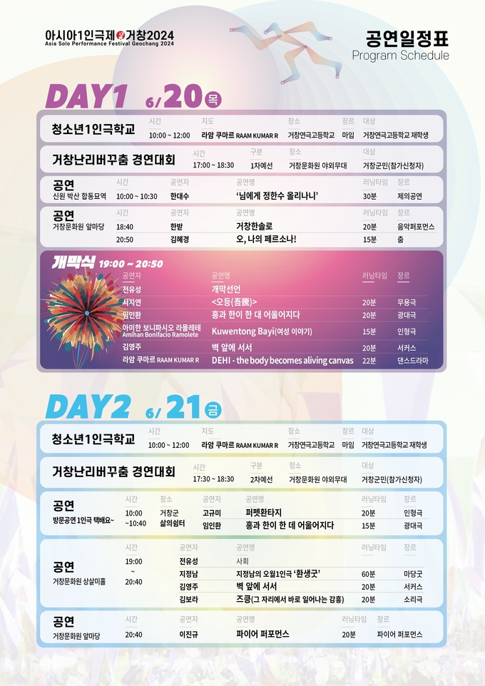1일차 - 6월20일(목) 오전10시 신원 박산합동묘역에서 한대수의 거창민간인학살사건 희생자를 위한 제의굿 ‘님에게 정한수 올리나니‘로 시작한다. 군청로타리에서 남주경 ‘무중력인간-흑’, 개막공연은 저녁 7시 거창문화원 상살미홀에서 한받 음악퍼포먼스 ‘거창한솔로’로 문을 열고 개그맨 전유성이 사회를 진행한다. 국내작품 서지연 무용극 오등<吾騰>, 임인환 광대극 ‘흥과 한이 한 대 어울어지다’, 김혜경 ‘오, 나의 페르소나!’ 해외작품 필리핀 아미한 보니 파시오 라몰레테의 인형극, 인도 라암 쿠마르의 댄스드라마까지 다양한 장르의 공연을 선보인다. 특히 필리핀 주한대사관 추천작인 인형극 KUWENTONG BAYI 와 인도의 전통무술 칼라리파야트를 바탕으로 한 댄스드라마 DEHI는 관객들에게 아시아의 다양한 1인 공연을 관람하는 기회를 줄것이다.