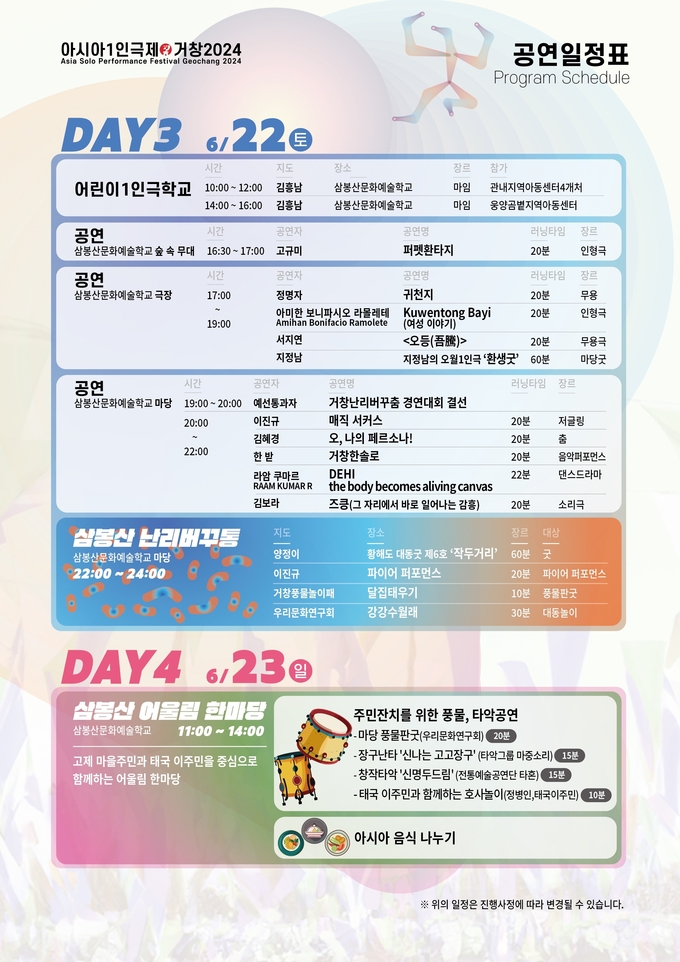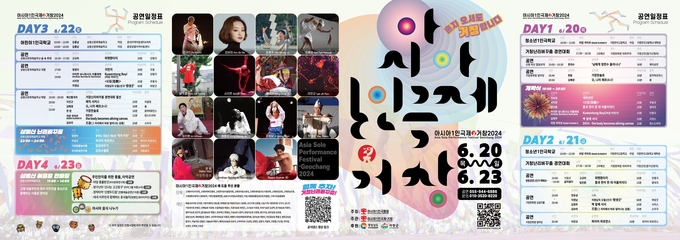주고있는 <아시아1인극제•거창2024 Asia Solo Performance Festival·Geochang2024>가 6월20(목)~6월23일(일)까지 신원 박산합동묘역, 거창문화원, 고제 삼봉산문화예술학교, 거창군 삶의쉼터, 군청로타리 등 거창군 일원에서 개최된다.