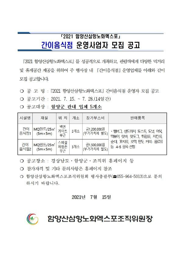 이번 공모에 대한 세부사항은 엑스포조직위원회․경상남도․함양군 누리집에서 확인할 수 있으며, 간이음식점 선정에 관한 보다 자세한 사항은 조직위원회 행사총괄부(☎055-964-5013)로 문의하면 된다.
