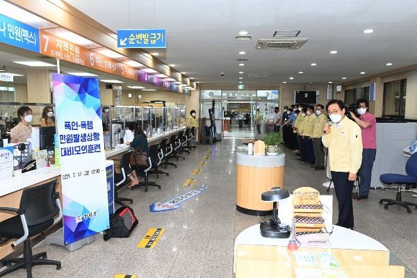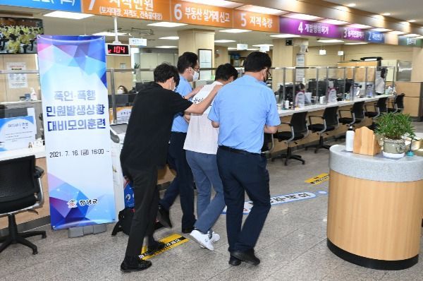 이날 훈련은 가해 민원인 진정·중재, 방문 민원인 대피, 가해 민원인 제압, 경찰 인계 순으로 진행됐다.