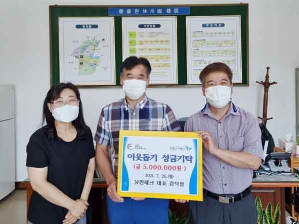 [경남도민뉴스] 함양군 휴천면은 지난 7월 26일 오전 함양 향우인 유빈테크 김덕철 대표가 면사무소를 방문하여 관내 저소득층 등 생활에 어려움을 겪고 있는 주민들을 위해 써달라며 이웃돕기 성금 500만원을 기탁했다고 밝혔다.