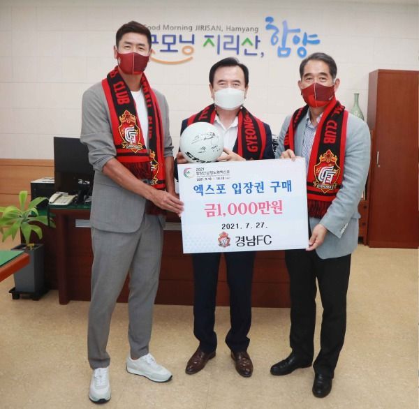 함양군에 따르면 27일 오후 경남FC 박진관 대표이사와 설기현 감독 등이 함양군청을 찾아 함양엑스포의 성공적인 개최를 응원하며 입장권 1,000만원 상당의 구매했다.