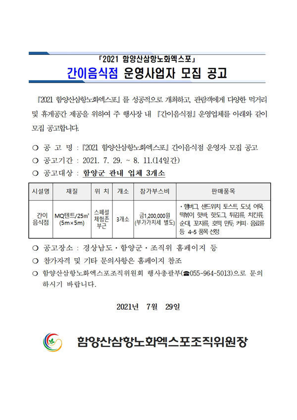 [경남도민뉴스] 함양산삼항노화엑스포조직위원회는 ‘2021함양산삼항노화엑스포’ 간이음식점 운영사업자를 7월 29일부터 8월 11일까지 14일 동안 모집한다고 밝혔다.