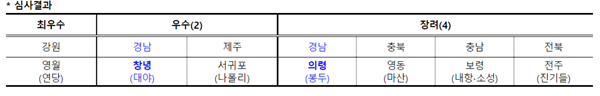 경상남도에서는 창녕 대야자연재해위험지구 정비사업(우수)과 의령 봉두재해위험지구 정비사업(장려)이 최종 선정되어 각각 국비 3억 원과 2억 원 총 5억 원의 국비 인센티브를 확보했다.