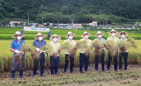 이날 관내 첫 벼 베기 행사에는 서춘수 함양군수를 비롯한 기관단체장, 농업인 등 20여명이 참석하여 벼 첫 수확을 축하했다.