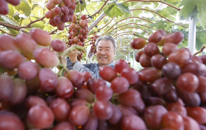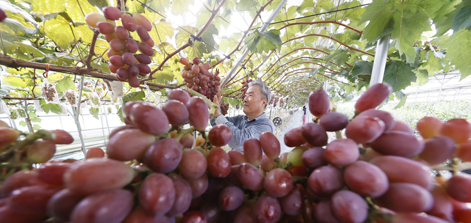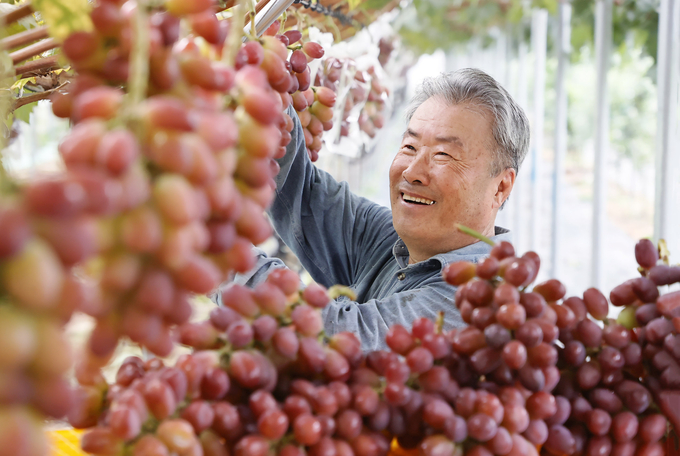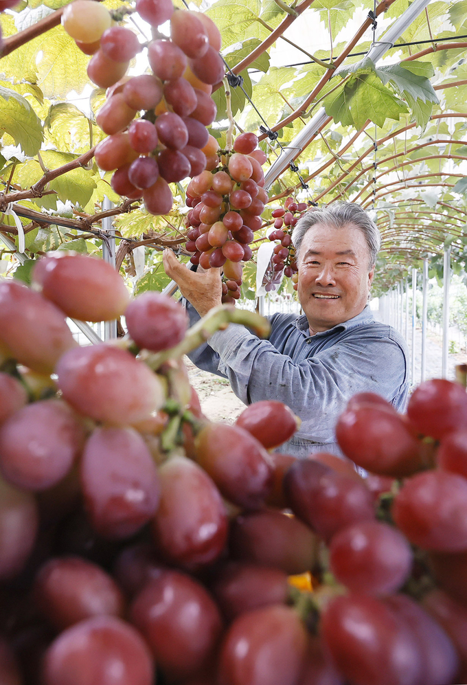 [경남도민뉴스] 처서를 이틀 앞둔 20일 경남 함양군 유림면 손곡마을 지리산 화남농원 포도하우스에서 민갑식씨가 알이 굵고 육질이 단단한 고당도 ‘미화희’ 포도를 수확하고 있다.
