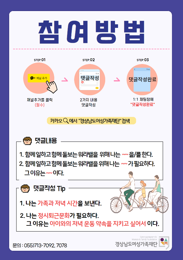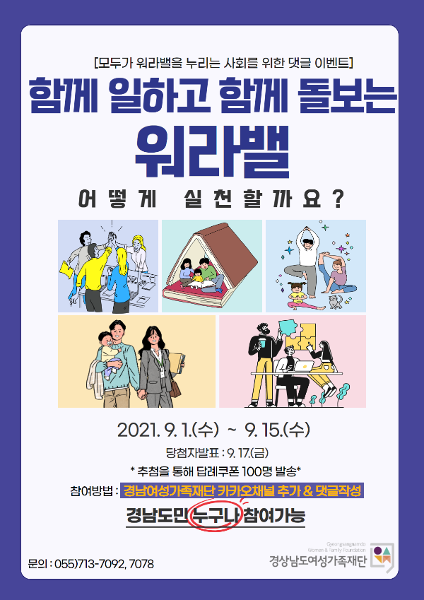 [경남도민뉴스] 경상남도 여성가족재단(대표이사 민말순, 이하 재단)은 ‘함께 일하고 함께 돌보는 워라밸’을 주제로 누리소통망(sns) 댓글 이벤트를 실시한다.