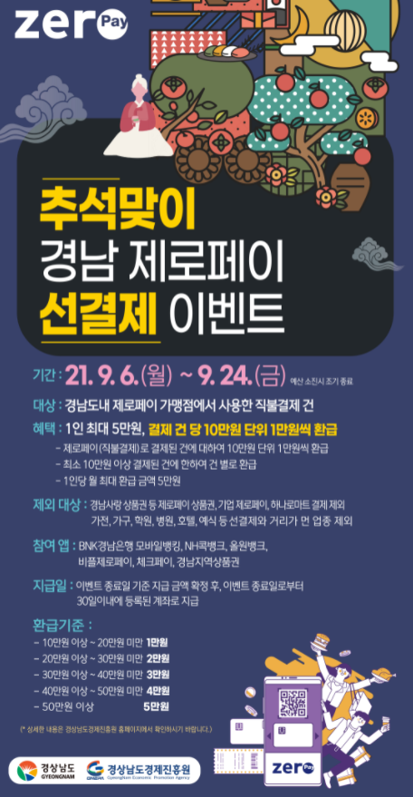 [경남도민뉴스] 경상남도와 (재)경상남도경제진흥원(원장 강성윤)은 코로나19로 어려움을 겪고 있는 소상공인 경영부담을 줄이고 소비 활성화를 위해 ‘추석맞이 경남 제로페이 선결제 이벤트’를 9월 6일부터 실시한다.