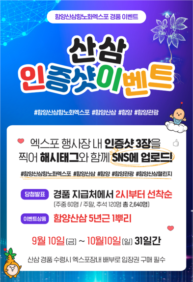 ‘인증샷 이벤트’는 엑스포 행사장 내에서 인증샷 3장을 찍어 해시태그와 함께 누리소통망(sns)에 업로드하면 오후 2시부터 선착순으로 함양산삼을 경품으로 증정한다.