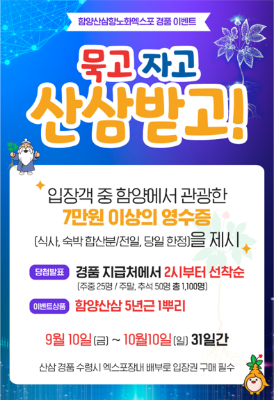 ‘묵고자고산삼받고 이벤트’는 함양에서 관광한 7만 원 이상의 영수증(식사, 숙박 합산분/전일, 당일 한정)을 제시하면 오후 2시부터 선착순으로 함양산삼을 경품으로 증정한다.