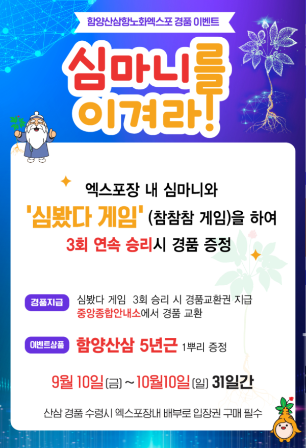 행사기간에 엑스포를 찾는 관람객들에게 경품 당첨의 행운과 다양한 재미를 주기 위해 마련한 이번 이벤트는 함양산삼의 우수성을 알려 지역내 산삼농가의 매출확대에도 도움이 될 전망이다.