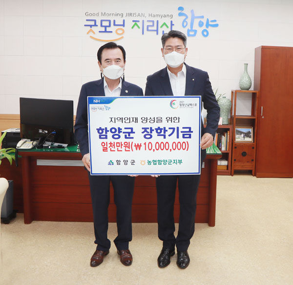 NH농협 함양군지부에서 전달한 1,000만원의 장학금은 (사)함양군장학회로 전달되어 함양의 다양한 지역인재들을 위해 사용될 예정이다.