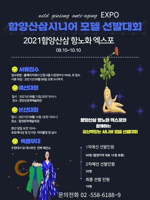 함양산삼시니어모델 선발대회는 총상금 400만 원이 걸린 대회로 서류 면접을 통해 50명의 예선 진출자를 선발하며, 13일 예선에서 30명을 선발한 후 14일 본선에서는 10명의 최종 진출자가 영예의 대상을 놓고 경합을 벌인다.