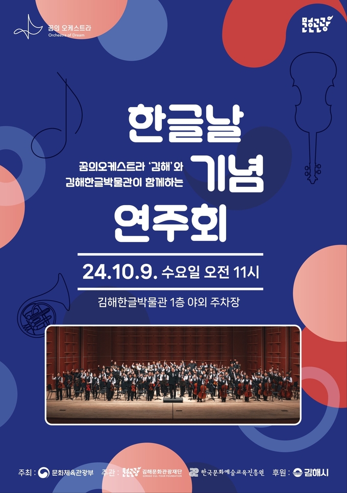 [경남도민뉴스=최미정 기자] ‘꿈의 오케스트라 김해’와 김해한글박물관이 함께‘578돌 한글날’을 맞아 음악과 문화가 어우러지는 특별한 기념 연주회를 개최한다.