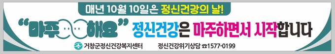 [경남도민뉴스=백형찬 기자] 거창군은 2024년 정신건강의 날을 기념하여 10월 7일부터 10월 18일까지 2주간 ‘정신건강 홍보주간’을 운영한다.