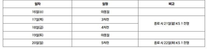 플레이오프가 4차전 이내에 종료될 시 한국시리즈 1차전은 예정대로 21일(월)에 진행되며, 20일(일) 플레이오프 5차전이 진행될 시 21일(월)은 이동일, 한국시리즈 1차전은 22일(화)에 진행된다.