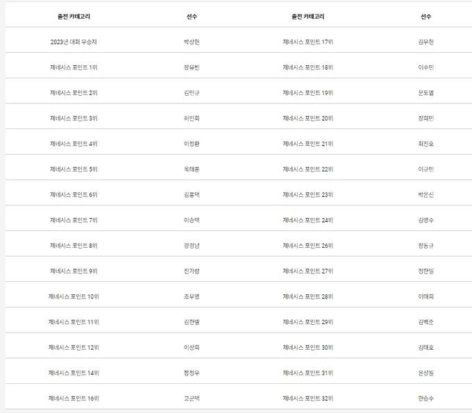 현재 7,218.89포인트로 제네시스 포인트 1위에 자리하고 있는 장유빈(22.신한금융그룹)을 필두로 2위 김민규(23.CJ), 3위 허인회(37.금강주택), 4위 이정환(33.우리금융그룹), 5위 옥태훈(26.금강주택), 6위 김홍택(31.볼빅), 7위 이승택(29), 8위 강경남(41.대선주조), 9위 전가람(29), 10위 조우영(23.우리금융그룹) 등 제네시스 포인트 TOP10을 비롯해 31위 윤상필(26.아르테스힐), 32위 한승수(38.하나금융그룹)까지 참가자 명단에 포함됐다.