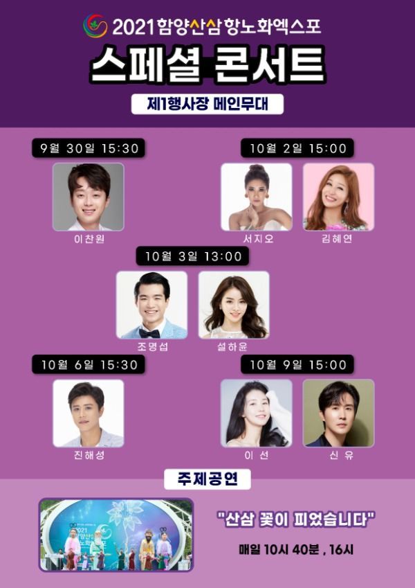 미스터트롯의 재간둥이 이찬원을 비롯하여 나태주, 진해성, 신유 등 트로트 대세들이 총출동하는 이번 스페셜 콘서트는 2021함양산삼항노화엑스포 제1행사장 메인무대에서 만나볼 수 있다.
