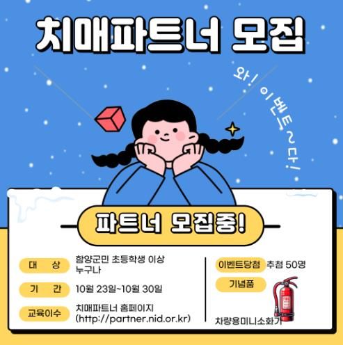치매파트너는 치매에 대한 교육을 받고 이를 바탕으로 지역사회에서 치매 환자와 가족을 배려하는 따뜻한 동반자를 말하는 것으로, 함양군보건소는 이달 23일부터 30일까지 치매파트너 가입 이벤트를 진행한다.