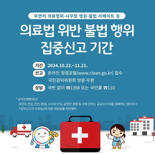 [경남도민뉴스=공동취재 기자] 무면허 의료행위·사무장 병원·불법 리베이트 등 의료법 위반 불법 행위 집중신고 기간(10.22.~11.21.) 운영합니다.