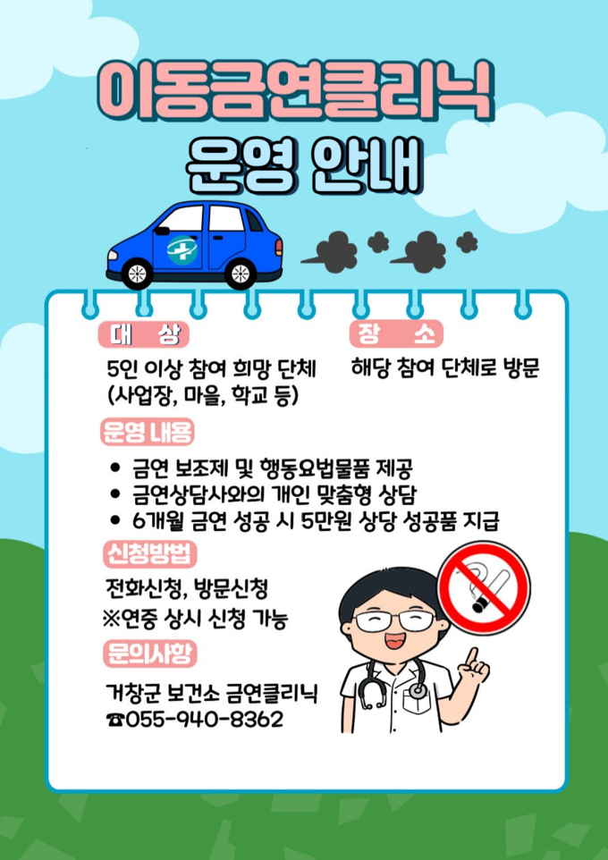 운영일정은 거창군청은 매주 월요일, 농업기술센터는 매주 목요일, 수도사업소는 매주 화요일 운영되며 거창읍 외 4개소(주상,위천,남상,가조)에는 매주 수·금요일 금연클릭닉을 운영할 계획이다.