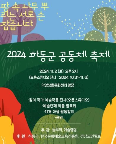[경남도민뉴스=이형섭 기자] 하동군 악양생활문화센터 소속 공동체들이 그간의 활동을 공유하는 ‘2024 악양생활문화센터 입주작가 성과공유회 및 공동체 축제’가 오는 11월 2일 오후 2시 악양생활문화센터에서 열린다.
