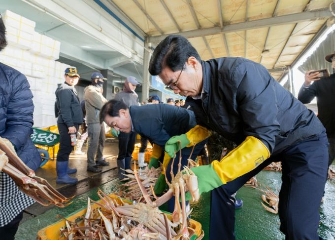 경매 현장을 찾은 김광열 영덕군수는 김성식 강구수협장 등과 함께 어업인, 강구대게거리 상인, 중매인들을 격려하고 영덕대게를 포함한 수산업 발전에 여러 의견을 나눴다.