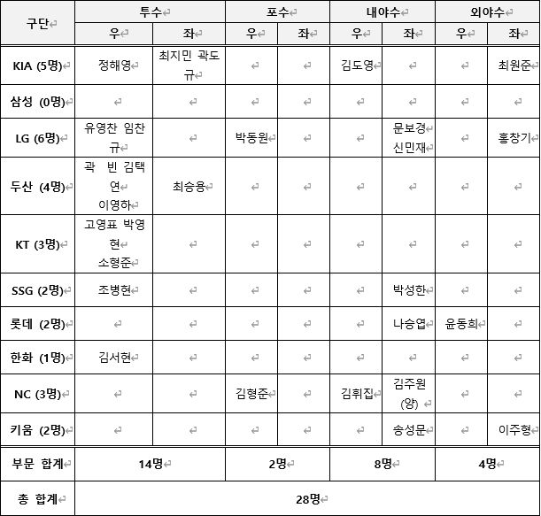 6일(수)까지 대표팀 훈련에 참가 중이던 34명의 선수 중 투수 김시훈(NC), 엄상백(KT), 전상현(KIA), 조민석(상무), 포수 한준수(KIA), 내야수 김영웅(삼성)이 최종 명단에 합류하지 못했다.
