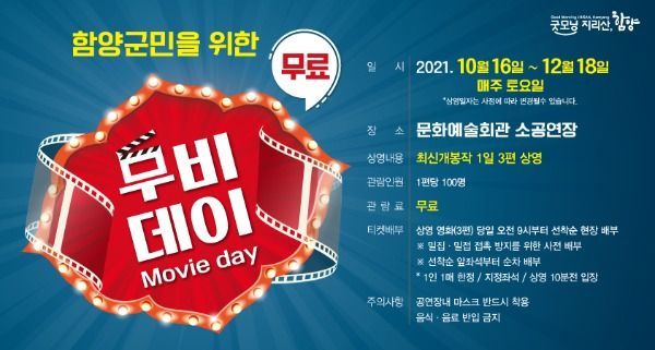 [경남도민뉴스] 함양군문화예술회관은 영화 관람을 위해 인근 도시로 가야 하는 군민들의 불편을 해소하기 위해 오는 10월 16일부터 12월 8일까지 매주 토요일 최신 개봉영화 3편을 무료로 상영한다.