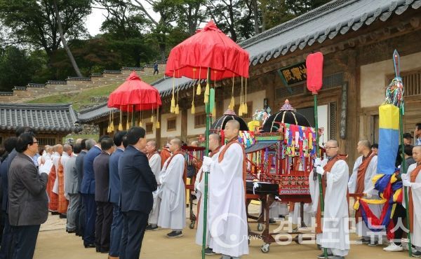 (합천/권연홍 기자) = 팔만대장경 진본 여덟 점의 이운(移運)을 알리는 고불식(告佛式)이 16일 해인사 장경판전 법보전 앞마당에서 진행됐다.