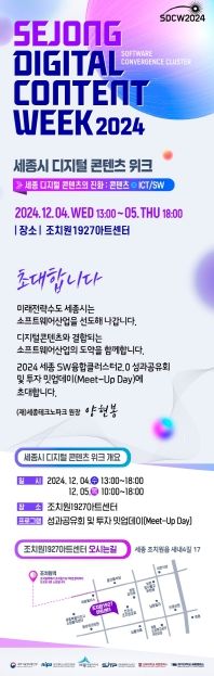 [경남도민뉴스=도문호 기자] 세종테크노파크는 오는 12월 4일부터 5일까지 조치원 1927 아트센터에서 ‘2024 세종 디지털 콘텐츠 위크’를 개최한다고 밝혔다.