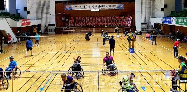 (거창/최병일) = 경남장애인배드민턴협회가 주·최·주관하고 경상남도와 거창군(군수 양동인)이 후원하는 2017 영호남장애인 배드민턴대회가 지난 22일 거창군 실내체육관에서 열렸다. 대전광역시와 영호남 각 지역에서 100여 명의 선수가 참여한 가운데 휠체어4인, OPEN좌식4인, 지체 단식, 지적 단식 등 4개의 종목으로 진행됐다.