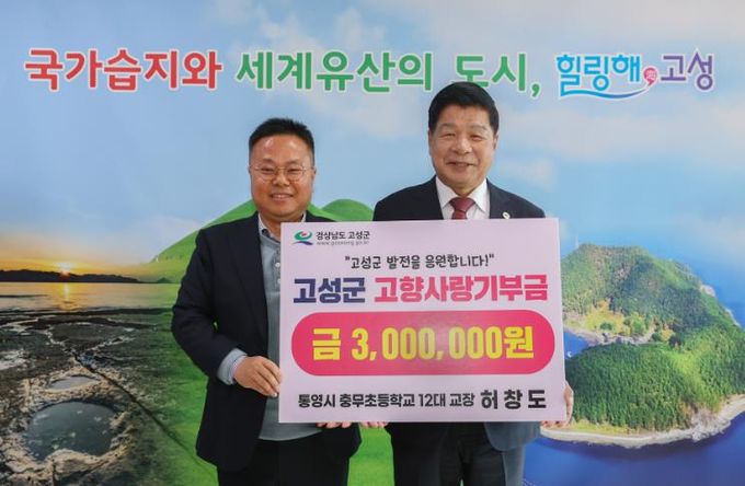 [경남도민뉴스=이형섭 기자] 경남 고성군은 5일, 대가면이 고향인 허창도 통영시 충무초등학교 12대 교장이 고향사랑기부금 300만 원을 기탁했다고 밝혔다.