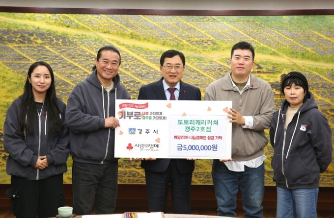 [경남도민뉴스=이돈휘 기자] 도토리 캐리커쳐 경주2호점이 12월 13일 경주시청을 방문해 ‘희망2025 나눔캠페인’ 성금 500만 원을 기탁했다.