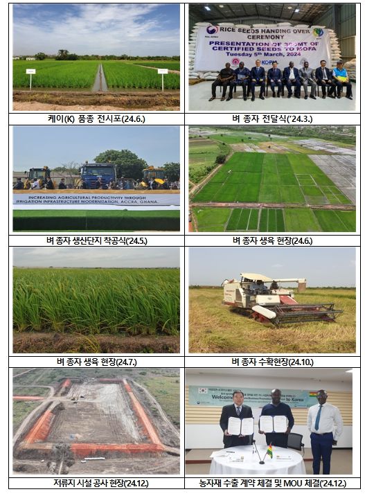 농식품부는 2023년부터 케이(K)-라이스벨트 프로젝트를 통해 가나를 포함한 아프리카 7개 국가에서 우리나라 다수확 벼 종자를 시범 생산하여 보급하고 있다. 아울러, 동 프로젝트와 연계하여 비료, 농약, 농기계 등 우수한 국산 농기자재의 아프리카 시장 진출을 위해 민간 기업을 대상으로 아프리카 농자재 시장·제도 조사를 지원하고 현지 홍보를 위해 전시포(展示圃) 조성 사업 등을 병행해 왔다.