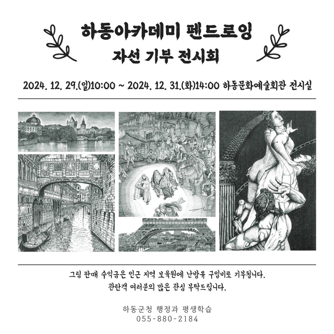 [경남도민뉴스=이형섭 기자] 하동아카데미 펜드로잉 수강생들의 ‘자선 기부 전시’가 오는 12월 29일부터 12월 31일까지 하동문화예술회관 전시실에서 열린다. 그림 판매 수익금은 순수 제작 경비를 제외한 전액이 인근 지역 보육원 난방유 구입비로 기부될 예정이다.