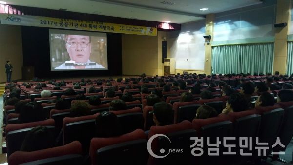 (합천/권연홍 기자) = 합천군(군수 하창환)에서는 8일 종합복지관 3층 대강당에서 전 직원을 대상으로 「2017년 공공기관 4대폭력 예방교육」을 실시했다.
