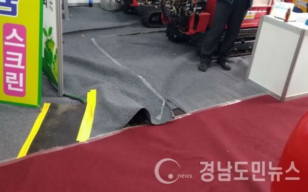아래 사진은 농기계 전시관의 또다른 모습이다. 바닥에 깔린 카펫이 무거운 농기계의 시운전으로 접착테이프가 떨어지고 말려 올라간 모습이다.