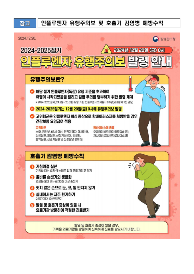 50주 차(12.8. 부터 12.14.)에 전국 독감(인플루엔자) 표본감시기관 의원급 외래환자가 1천 명당 13.6명으로, 2024 부터 2025절기 독감(인플루엔자) 유행 기준인 8.6명을 초과해, 지난 20일 0시부터 전국에 ‘독감(인플루엔자) 유행주의보’가 발령됐다.