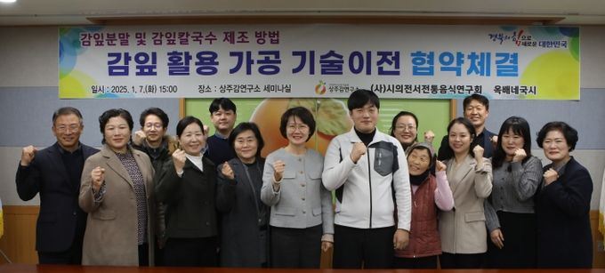 [경남도민뉴스=이돈휘 기자] 경상북도농업기술원은 감잎의 부가가치를 높이고 이를 지역 특산물로 개발하기 위해 7일 상주감연구소에서 ‘감잎분말 및 감잎칼국수 제조 기술’ 이전 협약을 체결했다.