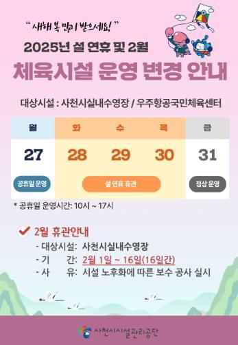 [경남도민뉴스=김종태 기자] 사천시시설관리공단에서 운영 중인 체육시설 사천시실내수영장과 우주항공국민체육센터가 설 연휴기간인 1월 28일부터 30일까지 휴관한다.