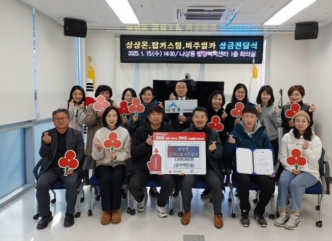 나성동은 15일 ‘상상온(대표 방재용)’, ‘탑커스텀(대표 신동호)’, ‘비주얼카(대표 윤상민)’ 관계자 등 45명이 나성동지역사회보장협의체에 이웃사랑 성금 200만 원을 전달했다고 밝혔다.