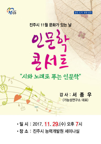(진주/최광용 기자) = 진주시는 오는 29일 오후 7시 능력개발원 세미나실에서 『11월 문화가 있는 날 인문학 콘서트』를 개최한다.